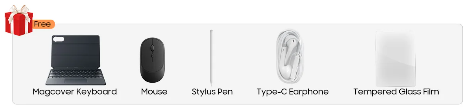 - マグネット式キーボード / 2. ワイヤレスマウス / 3. 高精度スタイラスペン / 4. 有線イヤホン / 5. 専用強化ガラスフィルム