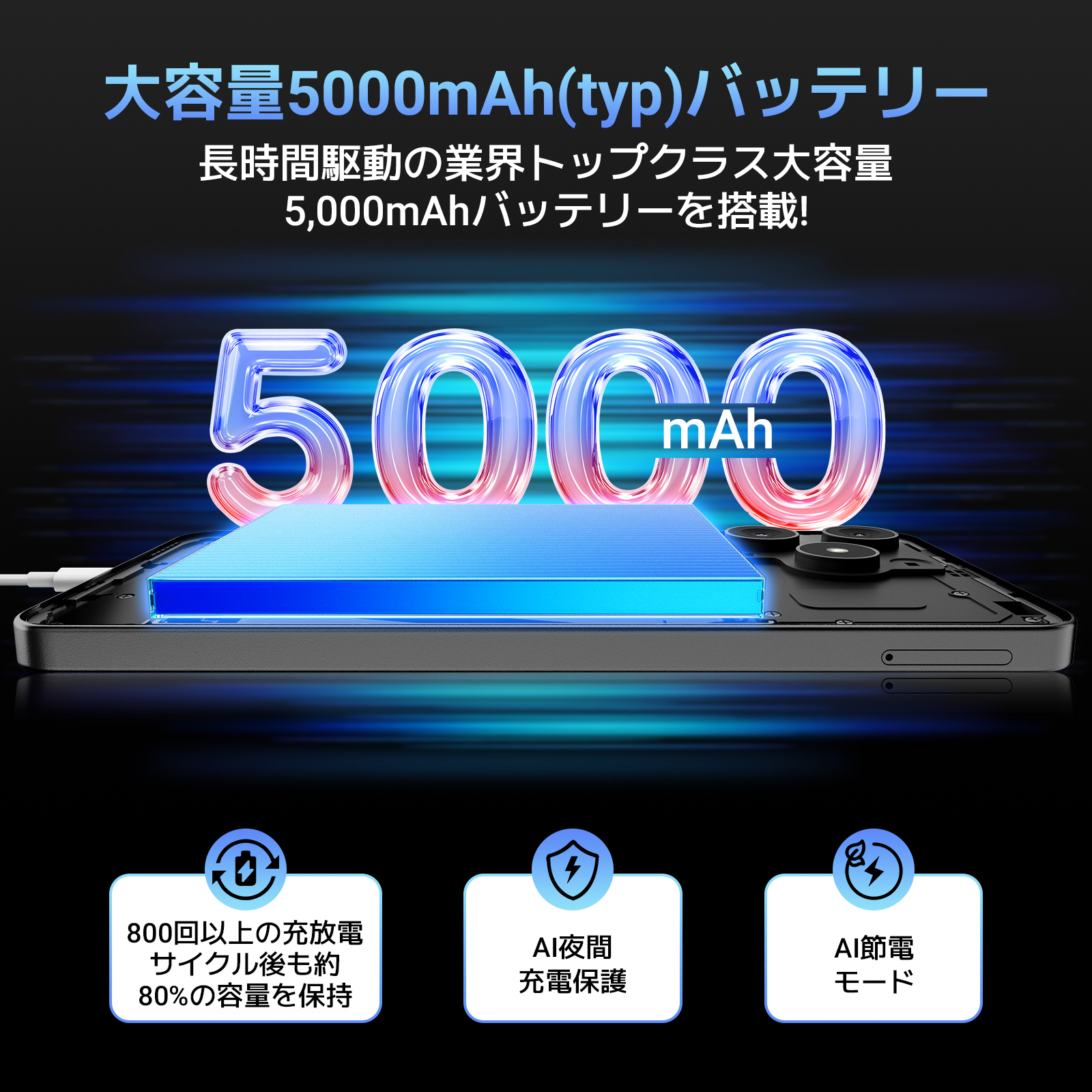 バッテリー容量は5000mAhです。これは現在のスマートフォンにおける標準的な大容量であり、特に注目すべき数値ではありませんが、一日の利用には十分なスタミナであり、バッテリー持ちに関して不満を感じることはないでしょう。
