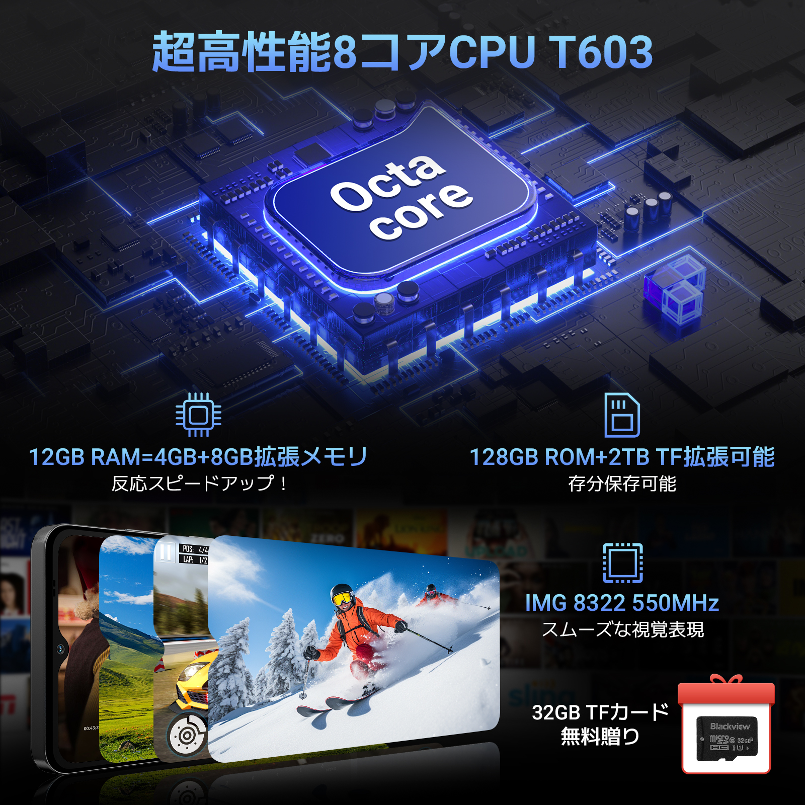 SoC(CPU)Unisoc T603日常使い向け。Web閲覧、動画視聴、LINEなどのSNS利用には対応できる性能。