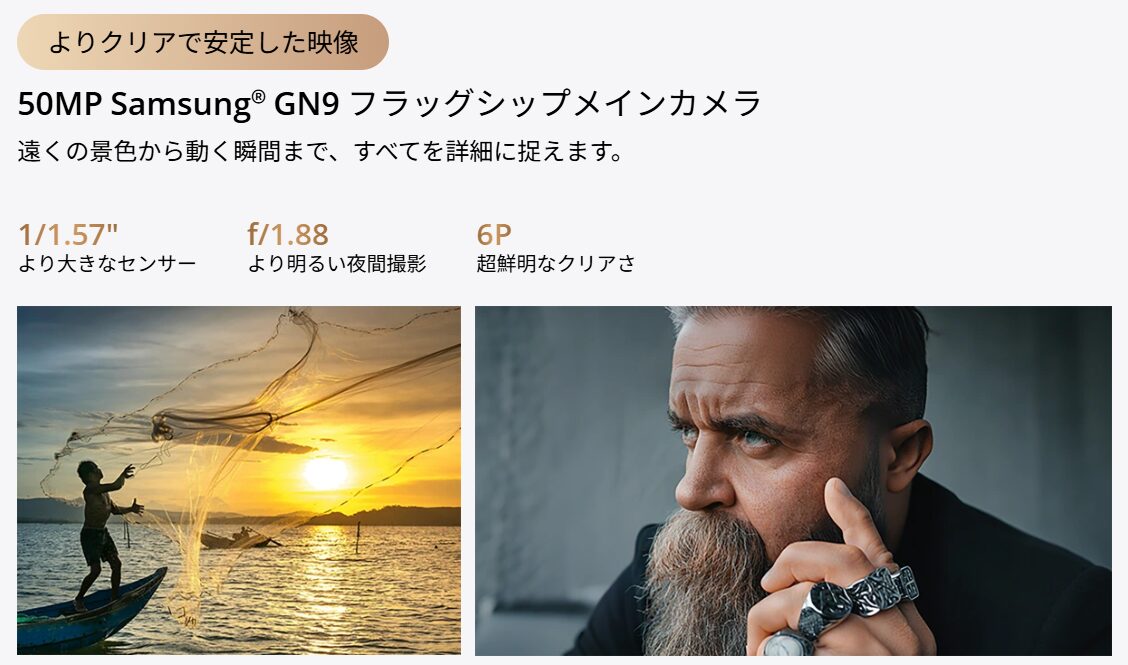 カメラは5,000万画素のメインカメラと2000万画素のナイトビジョンカメラを搭載。暗所撮影にも強く、夜釣りやキャンプシーンの記録にも最適です。
