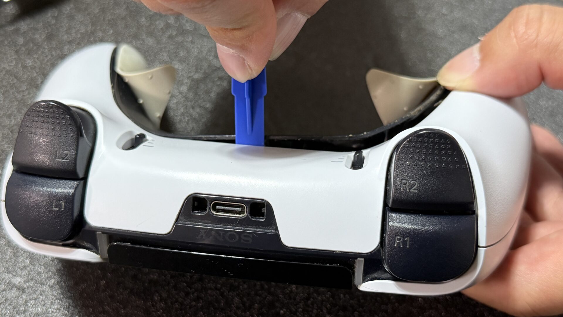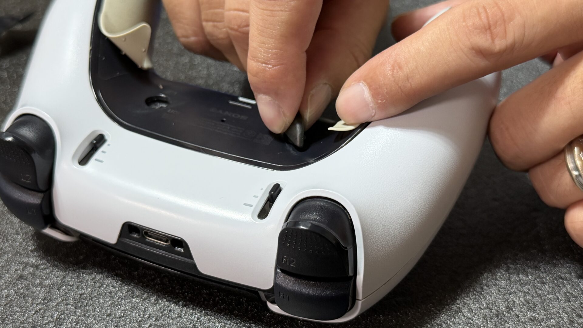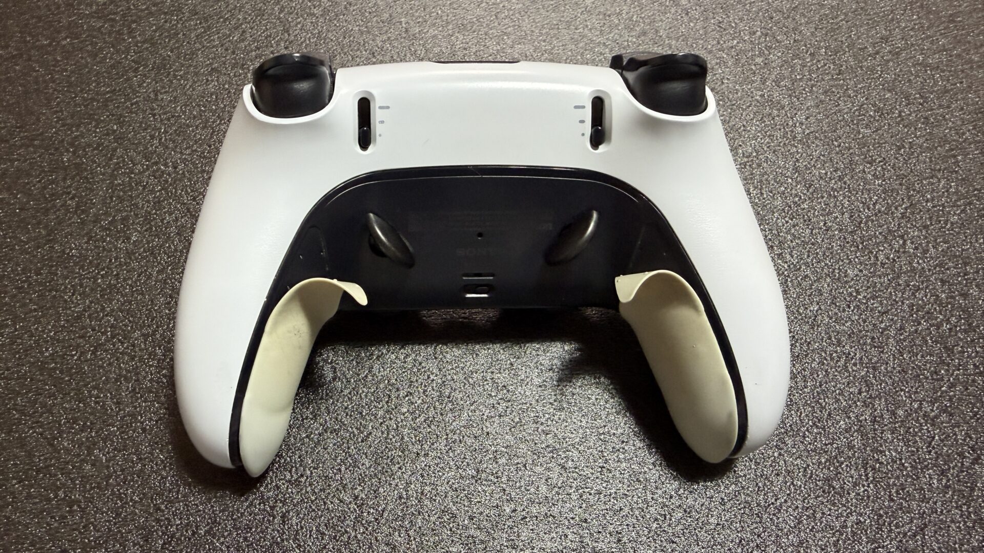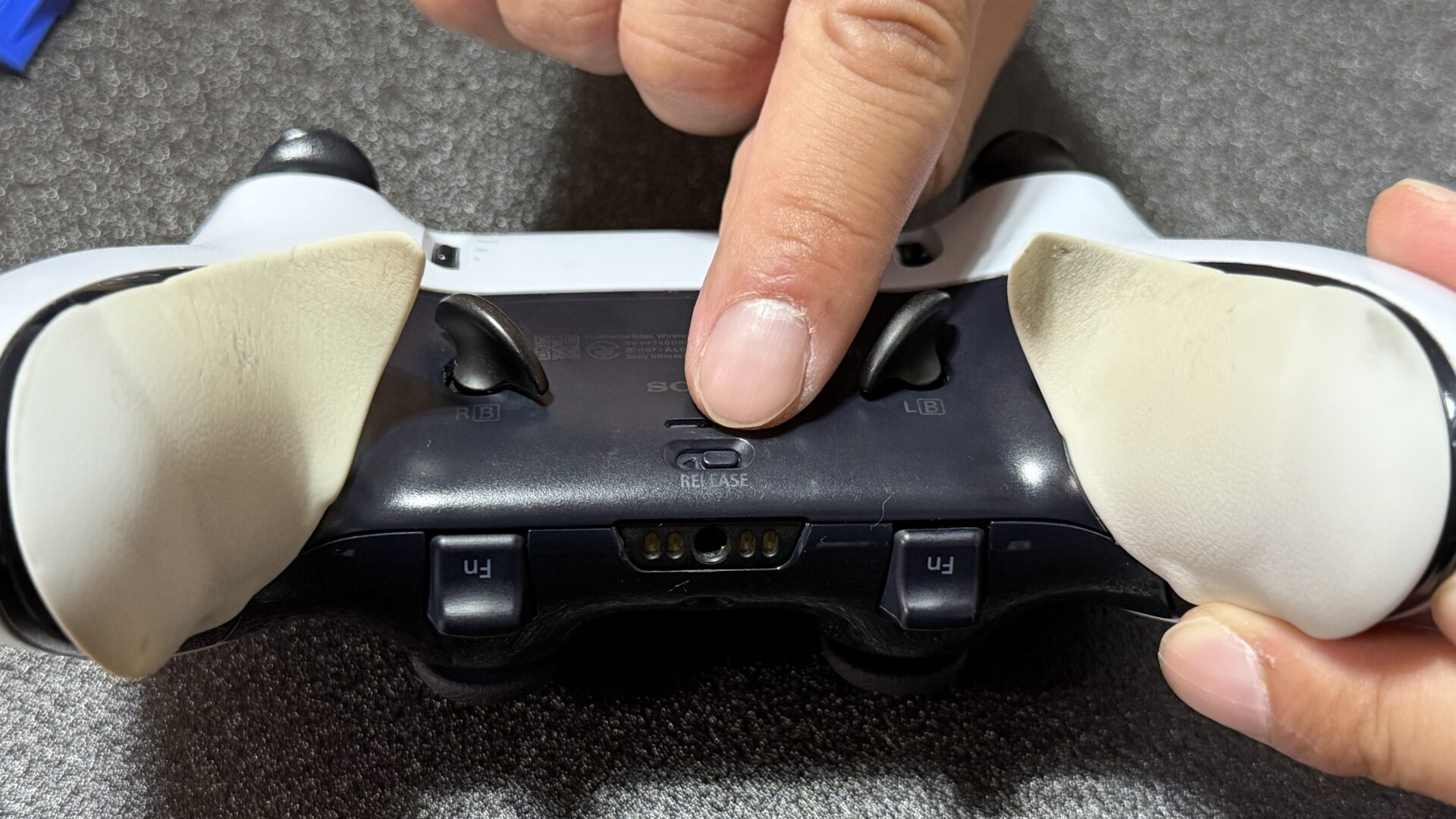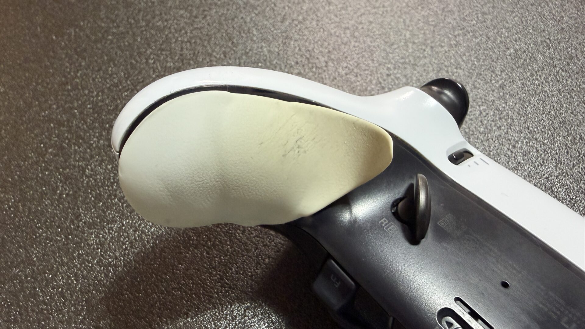 こちらが、実際に交換前の私のDualSense Edgeの状態です。ご覧の通り、グリップラバーが膨張し、端から剥がれてしまっています。
