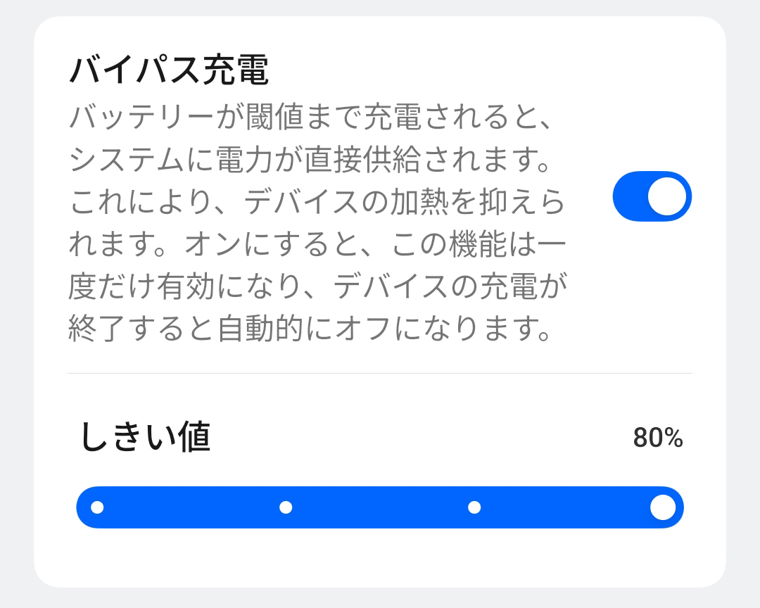 - バイパス充電: ケーブルを繋ぎながらでも、バッテリーを介さず本体に直接給電できるモードを搭載。