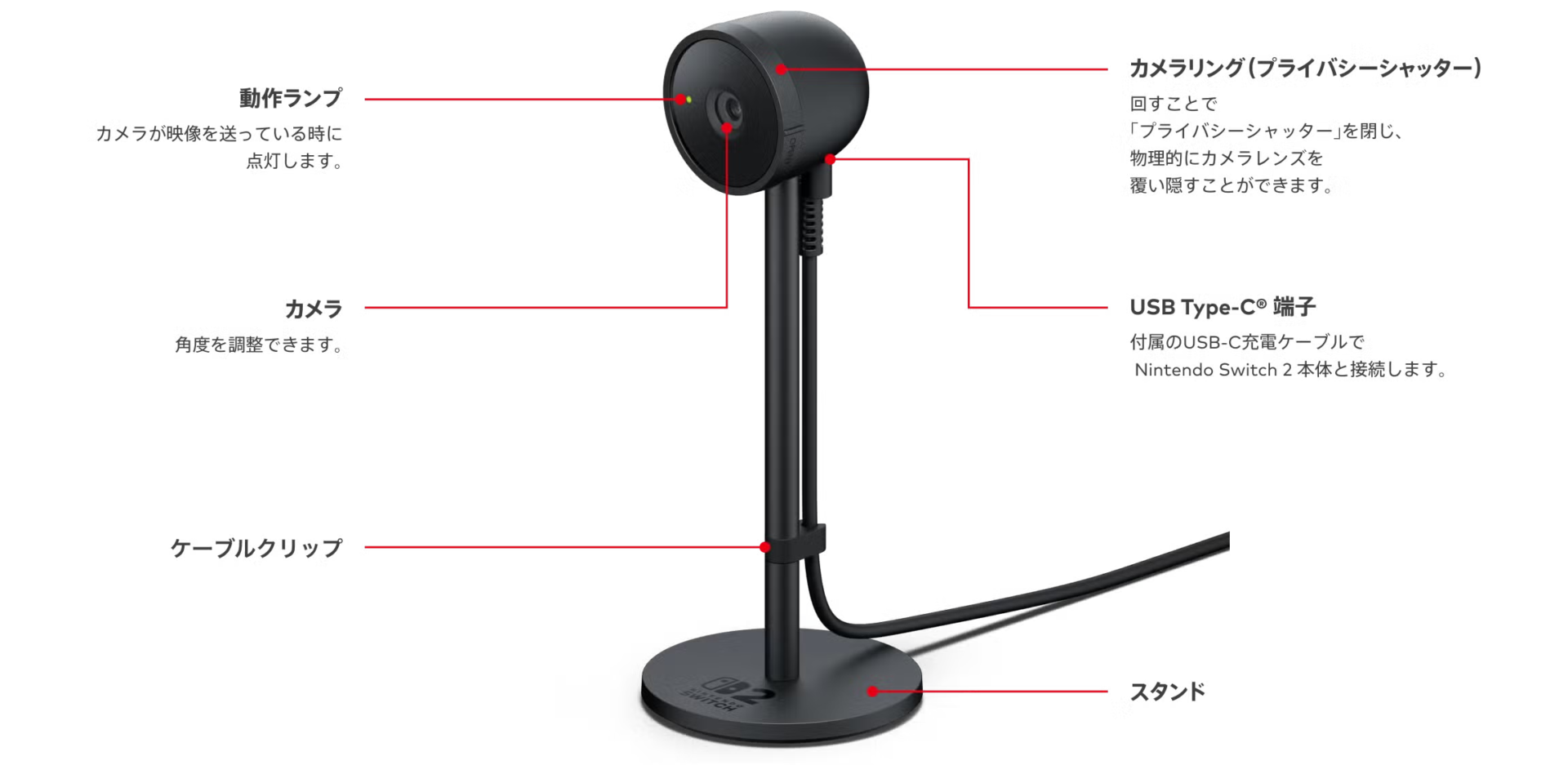 - ここがポイント: Switch 2の新機能「ビデオチャット」を可能にする専用カメラ。広角レンズと高感度センサーで、明るく広い範囲を映します。プライバシーシャッター付きで安心。