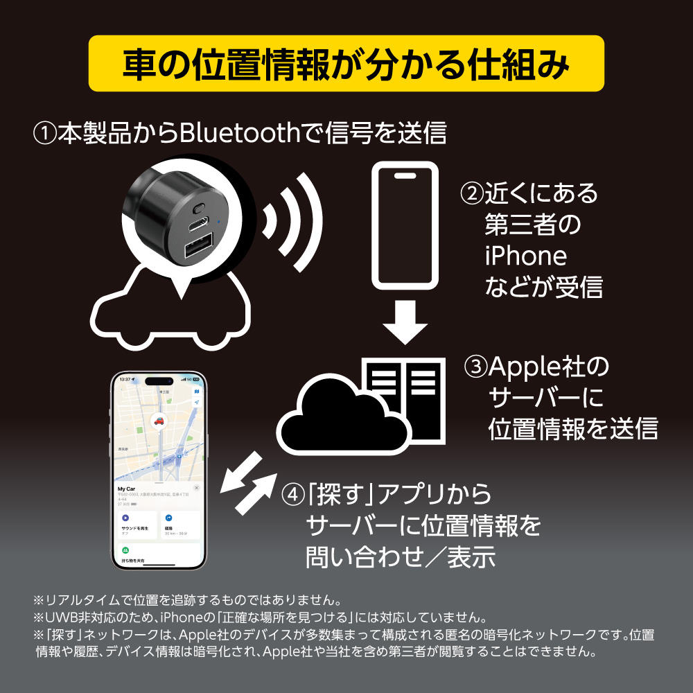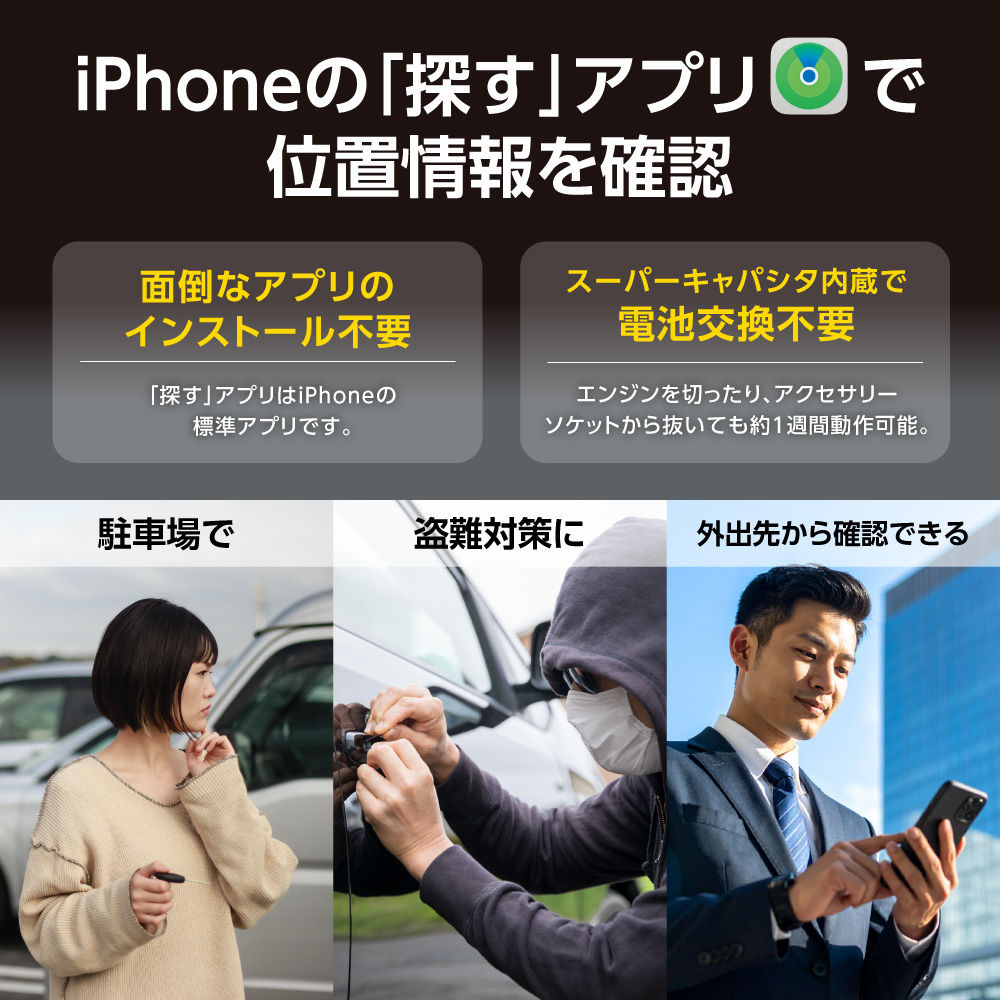 本製品の最大の特徴は、iPhoneやiPadに標準搭載されている「探す」アプリに対応している点です。Appleの「探す」ネットワークを利用することで、特別なアプリを別途インストールすることなく、手元のデバイスから車の位置を特定することができます。